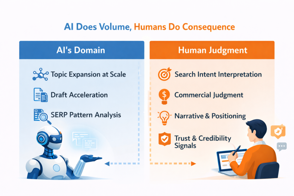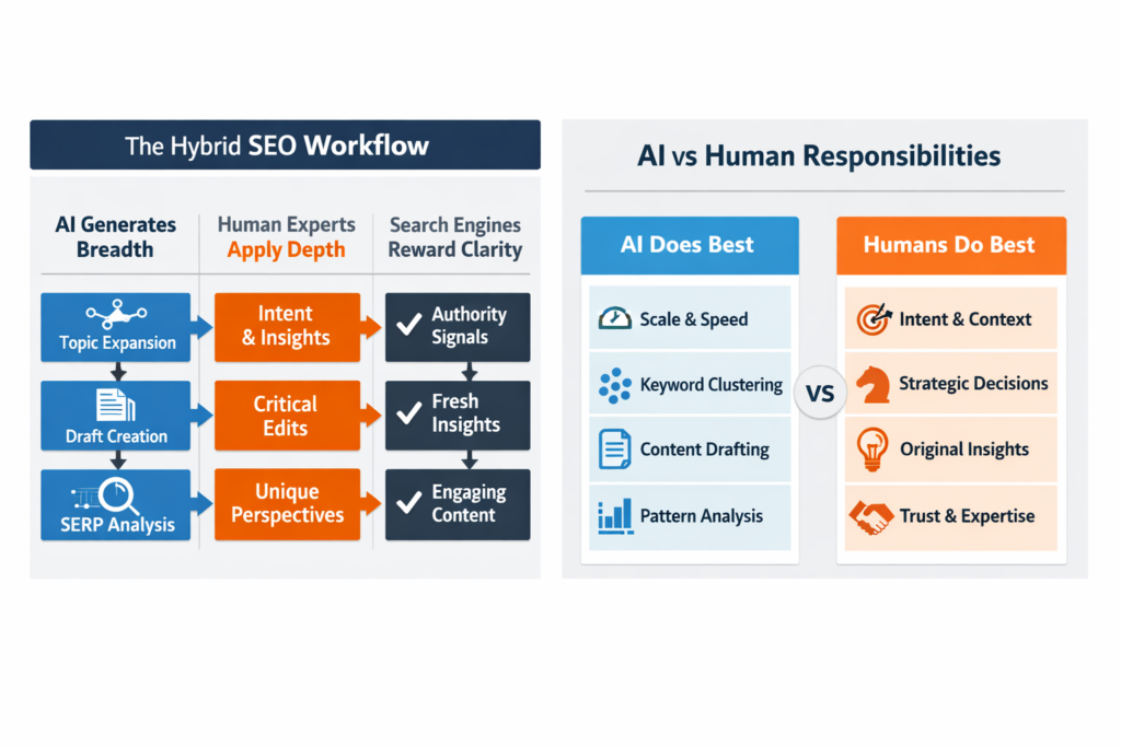 High-performance teams treat AI like an engine, not a driver. The workflow looks like this: AI generates breadth. Humans apply depth. Search engines reward clarity.